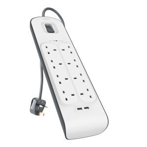 مشترك كهرباء بطول مترين بـ 8 مقابس ومنفذين USB من Belkin – أبيض