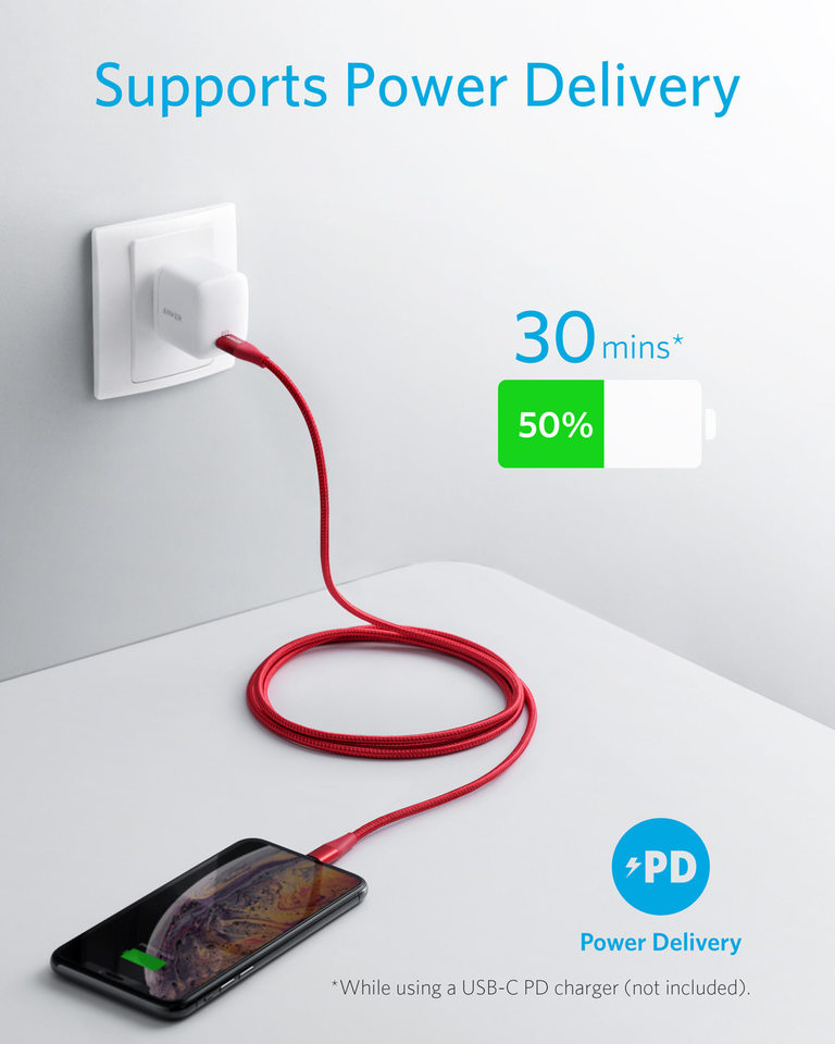 انكر باور لاين+ II بطول مترين من USB TYBE-C إلى Lightning – أحمر قماشي