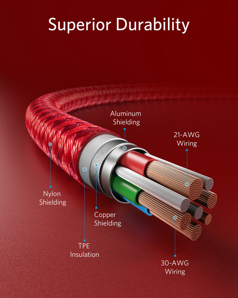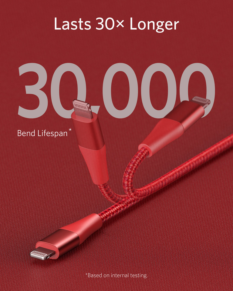 طاقة ثابتة: تدوم 30 مرة أطول من الكابلات العادية. ثبت في بيئة معملية أنه يتحمل 30000 انحناء.